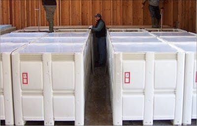 But wait, there is more math. We have 36 harvest bins. And that just so happens to be 12 trailer loads of 3 harvest tote bins. And those 36 harvest tote bins, at 4 per fermenter, will exactly fill 9 fermenters. How do you suppose that happened? Recheck your math on that furlong to fortnight conversion.