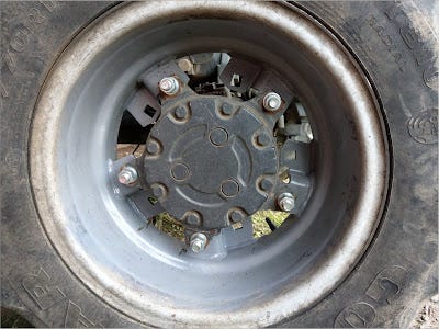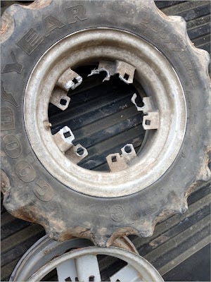 Plan B arose like a Phoenix out of the smoldering ashes of the decision tree. It turns out, Ernie had a spare wheel from his other wheel tractor, that does not have balls. It is 100 horsepower, just no balls. The wheel leaked air, so he replaced it. The replacement wheel also leaked air, so he put a tube in it. But the wheel fit a 20-inch tire, not an 18-inch tire. However, the center mounting spokes were identical.