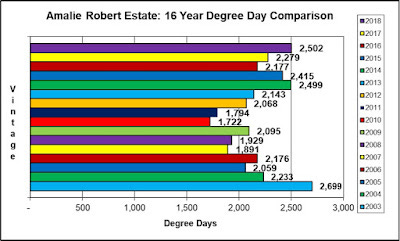And if you refer back to our handy-dandy Amalie Robert Estate, site specific Degree Day chart, you can see how the 5C rootstock with deep, moisture extracting roots, can help moderate these arid conditions of the last several years. In fact, 5C and own rooted grapevines are very similar in their rooting proclivities.