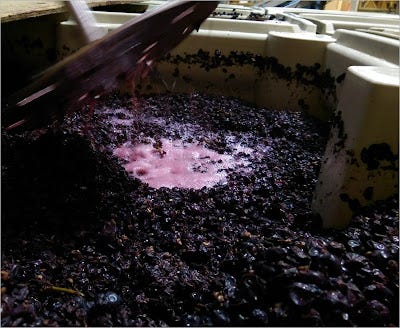 Now, you don’t really need to know any of that, it’s called a red herring. Doodle one of those on your desk blotter, because you won’t have any space here. But what you do need to know is that our fermenters can only hold 1.4 tons (2,800 pounds when you ferment with whole clusters as we do, and you would too). Herein lies the lesson: 36 buckets by 20 pounds by 4 harvest bins fills a fermenter properly. And by properly we mean it is so full that we can get a warm (but not hot) fermentation to extract all the great aroma, flavor and texture, but not so full that the wine overflows and makes its way to the drain. You know, a proper fermentation – not too hot, not too cold and certainly not overfull. On the other side of the coin, an overfull fermenter is a sad, but self-correcting situation.